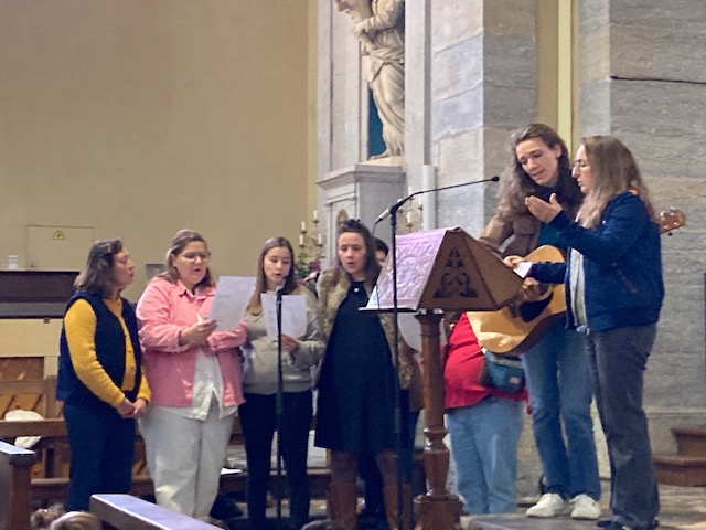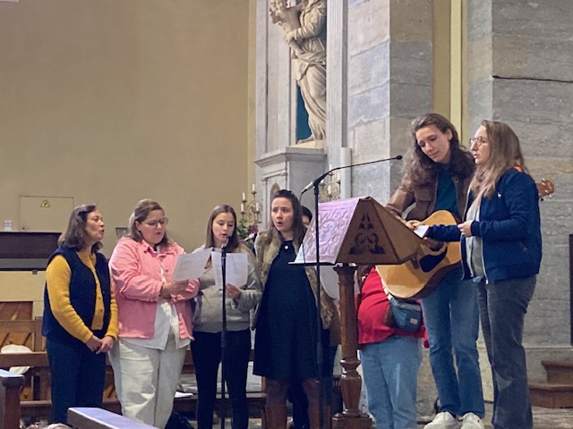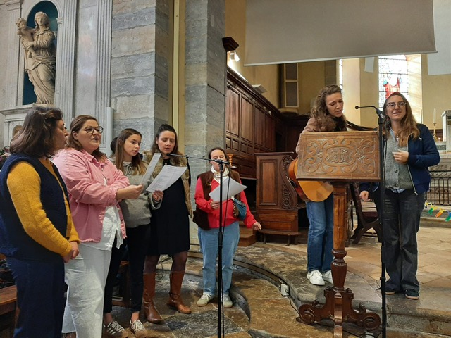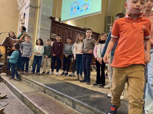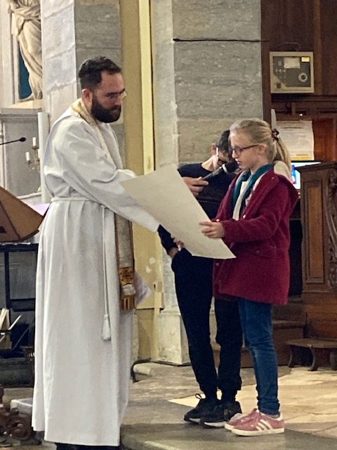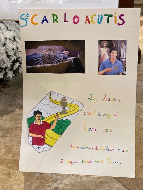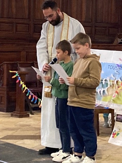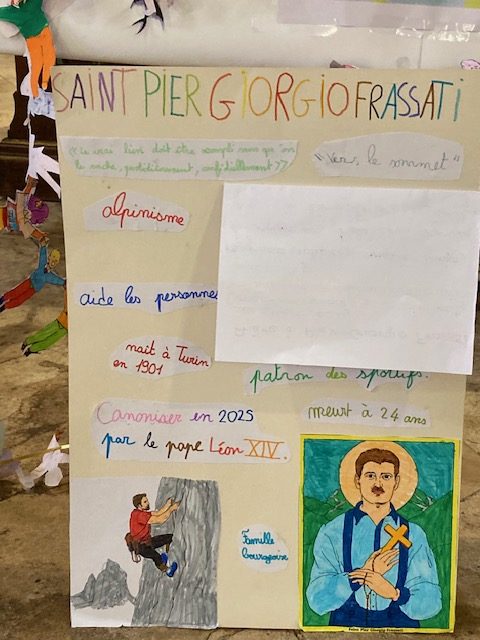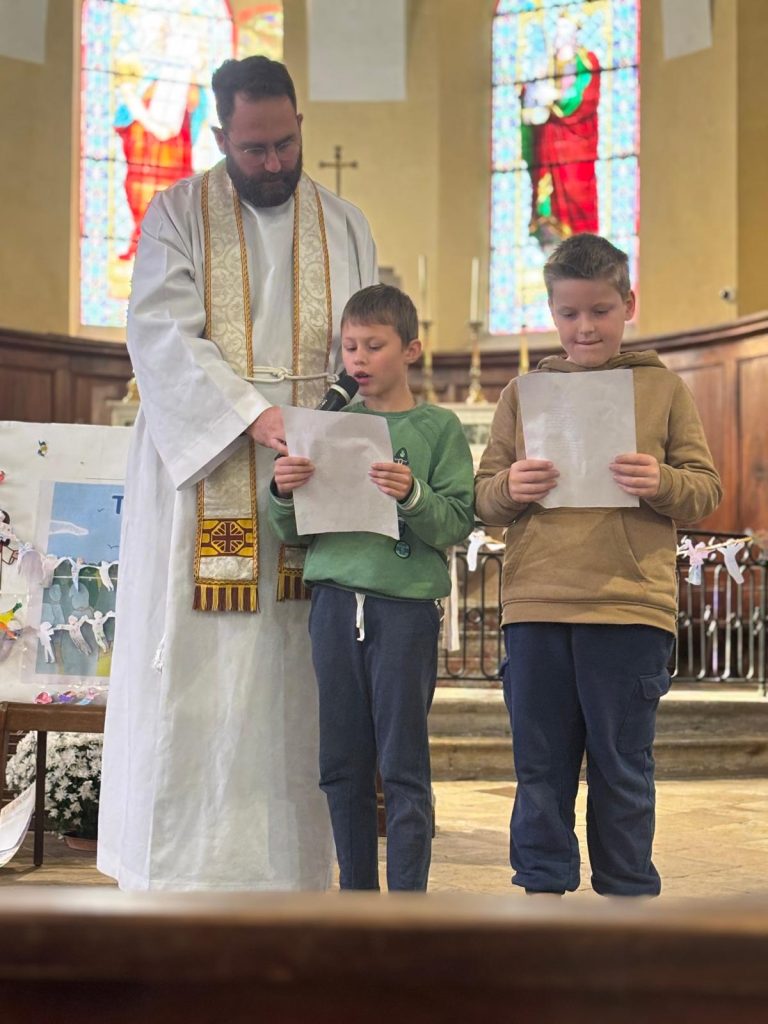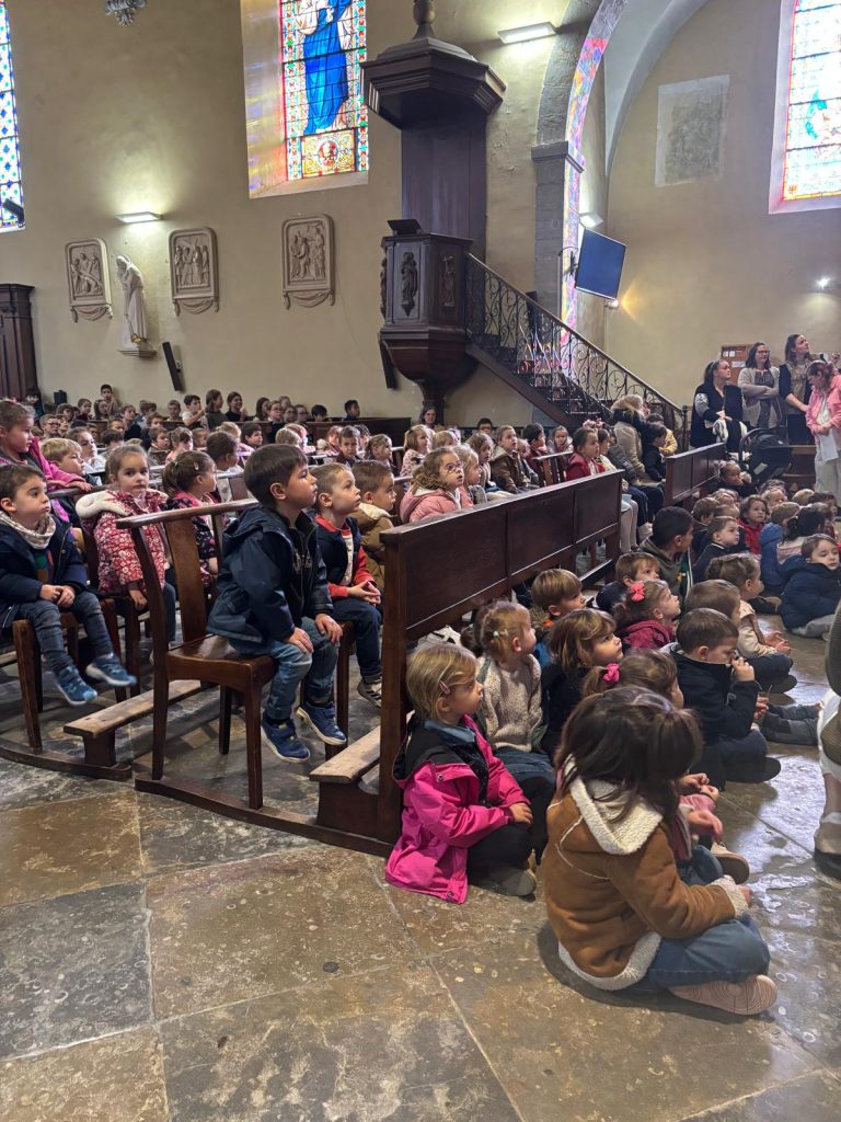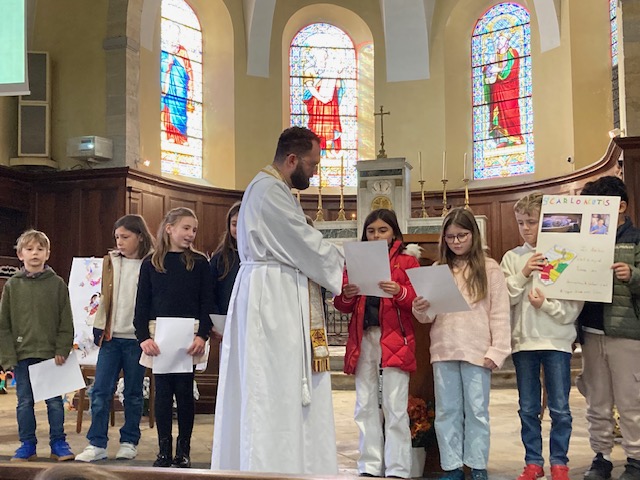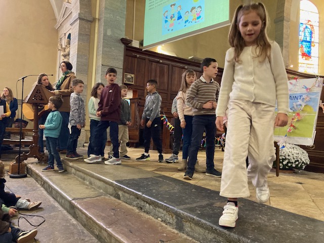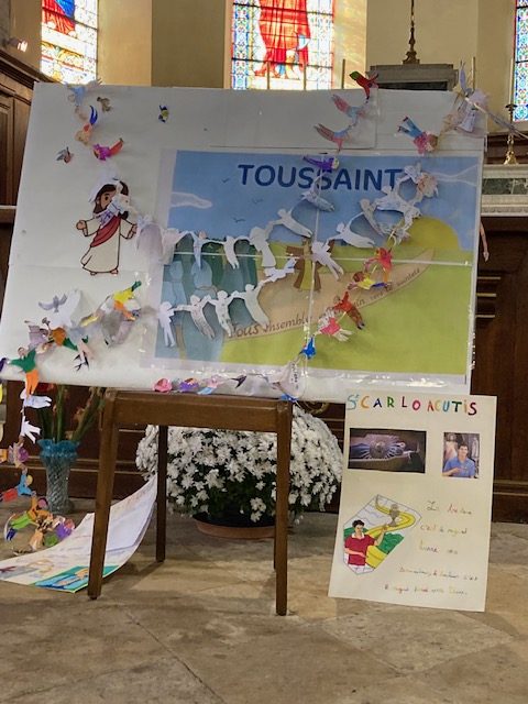 Vendredi 7 novembre, tous les élèves de l’école se sont rassemblés à l’église St André pour célébrer la fête de la Toussaint avec le père Thomas. Des parents et grands-parents étaient aussi présents. Pour la première fois, un groupe de mamans a animé ce Temps Fort, orgue et guitare ont rythmé les chants appris. Un groupe d’élèves a gestué l’évangile des Béatitudes, les grands ont présenté deux jeunes saints béatifiés par le pape Léon XIV, Carlos Acutis (1991-2006) et Pier Giorgio Frassati (1901-1925), les Ce2 ont lu la prière de St André et les enfants de la PS au CE1 ont décoré le chœur de l’église avec des ribambelles.