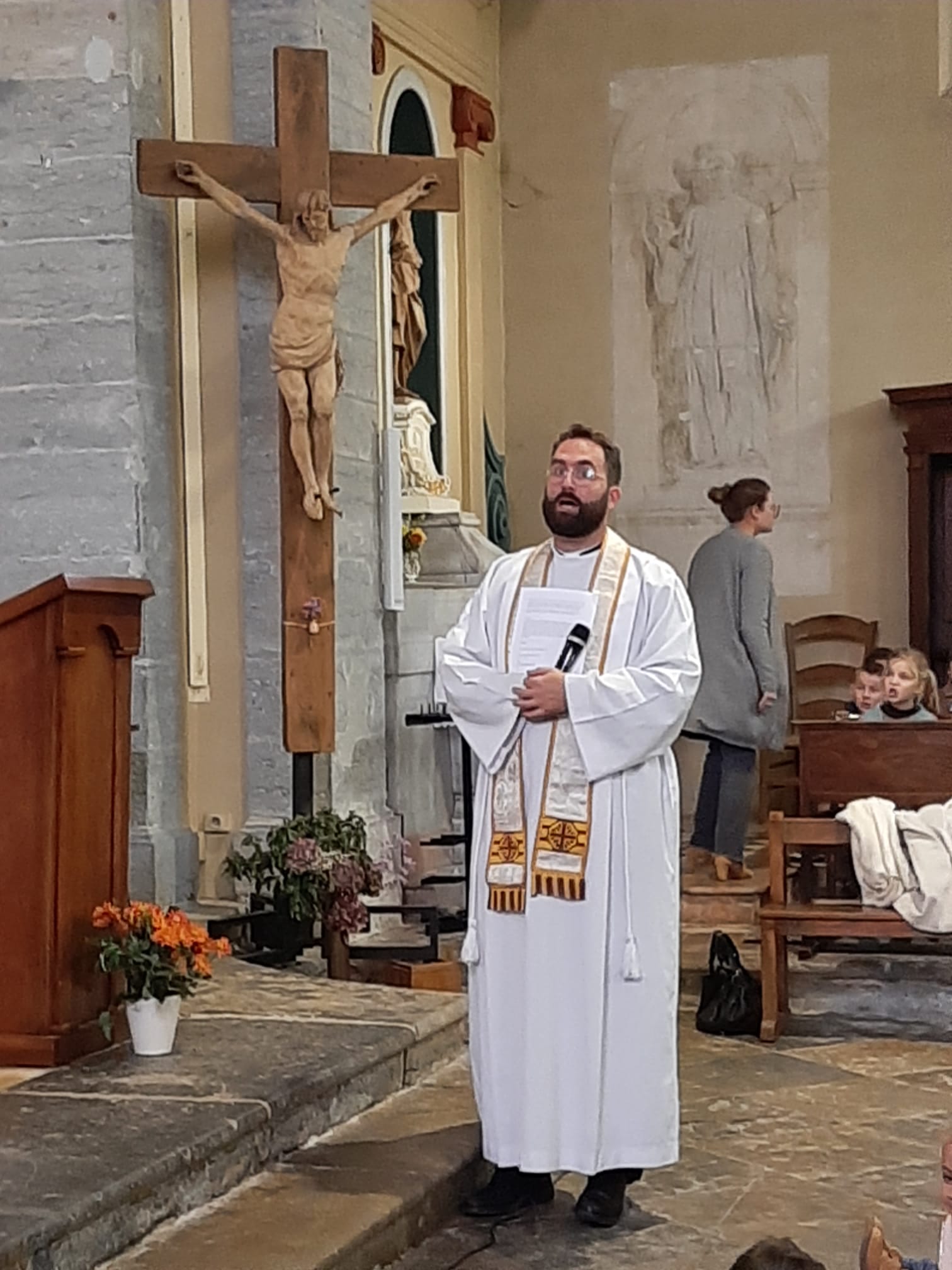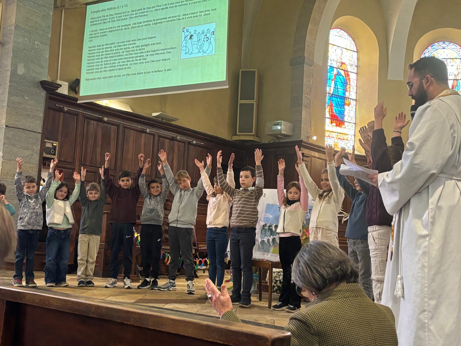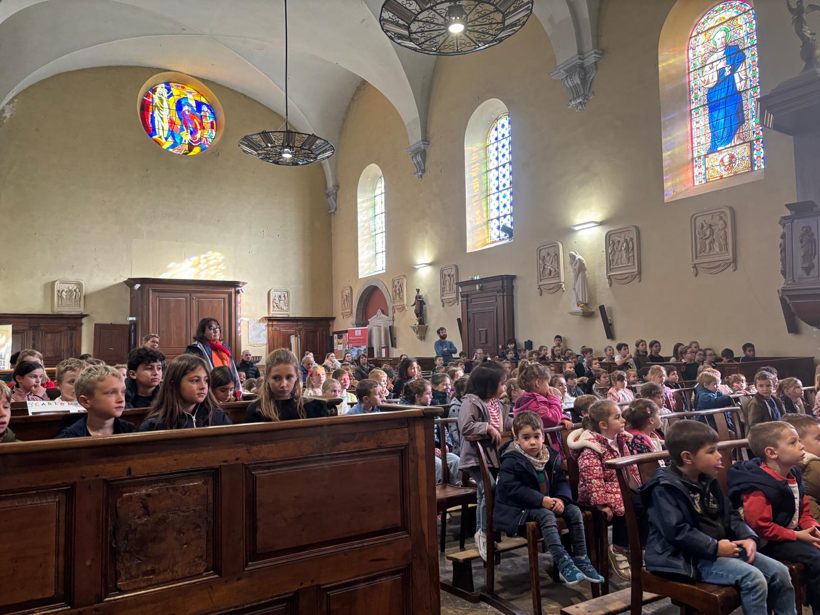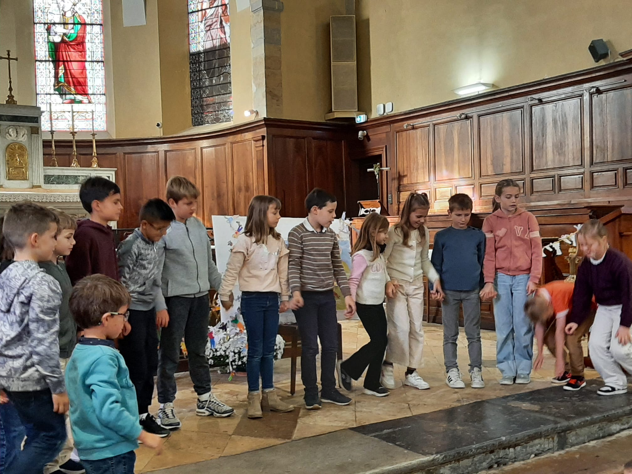 Vendredi 7 novembre, tous les élèves de l’école se sont rassemblés à l’église St André pour célébrer la fête de la Toussaint avec le père Thomas. Des parents et grands-parents étaient aussi présents. Pour la première fois, un groupe de mamans a animé ce Temps Fort, orgue et guitare ont rythmé les chants appris. Un groupe d’élèves a gestué l’évangile des Béatitudes, les grands ont présenté deux jeunes saints béatifiés par le pape Léon XIV, Carlos Acutis (1991-2006) et Pier Giorgio Frassati (1901-1925), les Ce2 ont lu la prière de St André et les enfants de la PS au CE1 ont décoré le chœur de l’église avec des ribambelles.