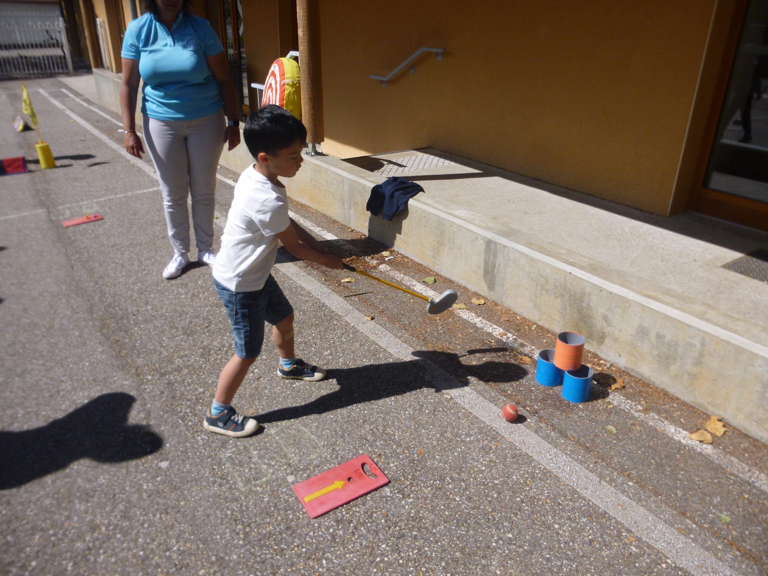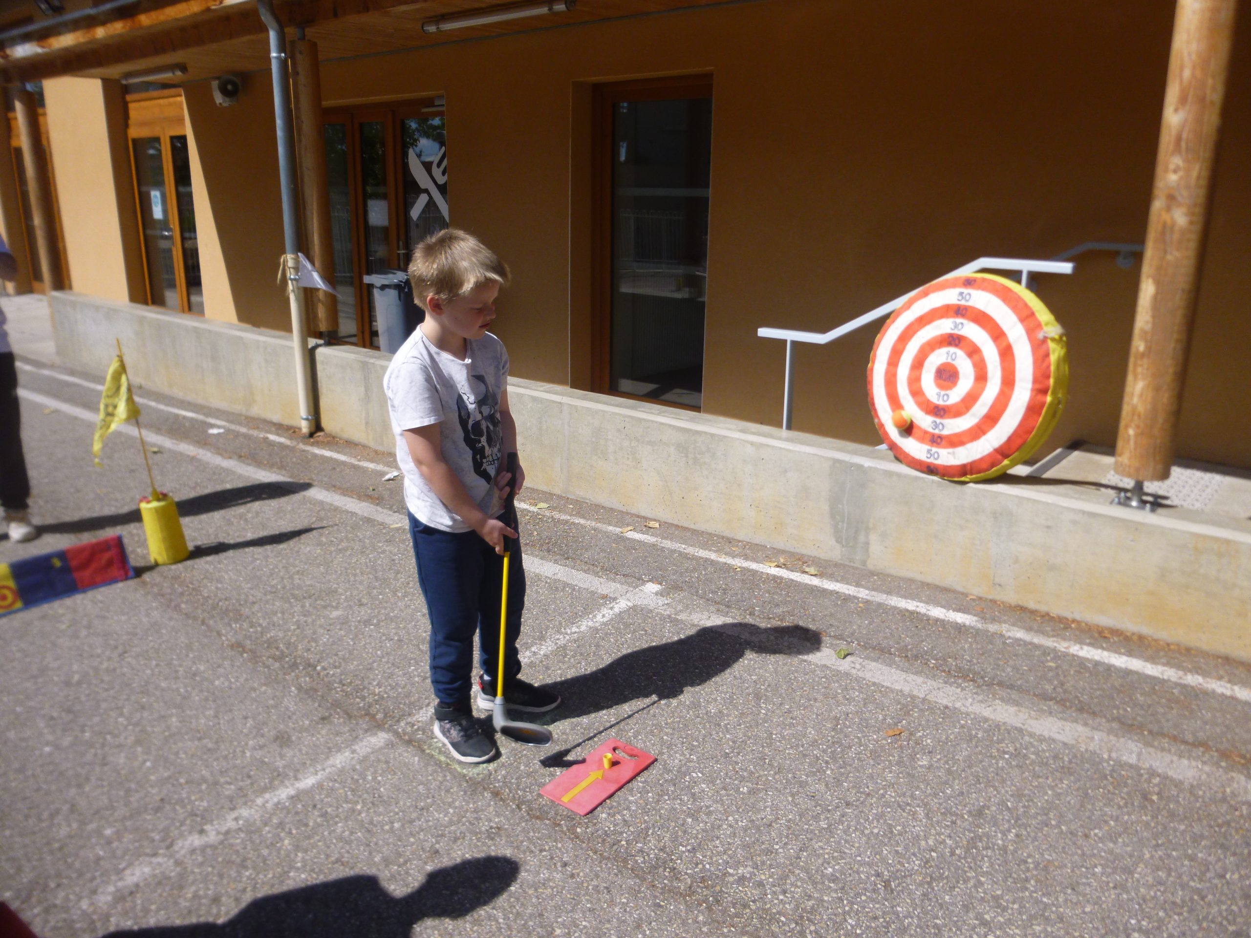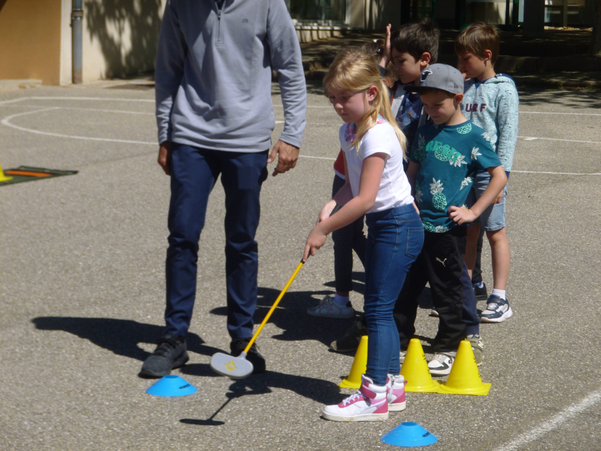 Aujourd’hui c’est avec beaucoup d’application et de concentration que les élèves de CP ont relevé ce nouveau défi : s’exercer à quelques rudiments du golf . Les parents de Soan , tous deux du métier avaient préparé des ateliers pour apprendre à viser , à lever , à diriger . Pas toujours simple , mais tous les enfants ont été ravis de découvrir ce sport . Merci !